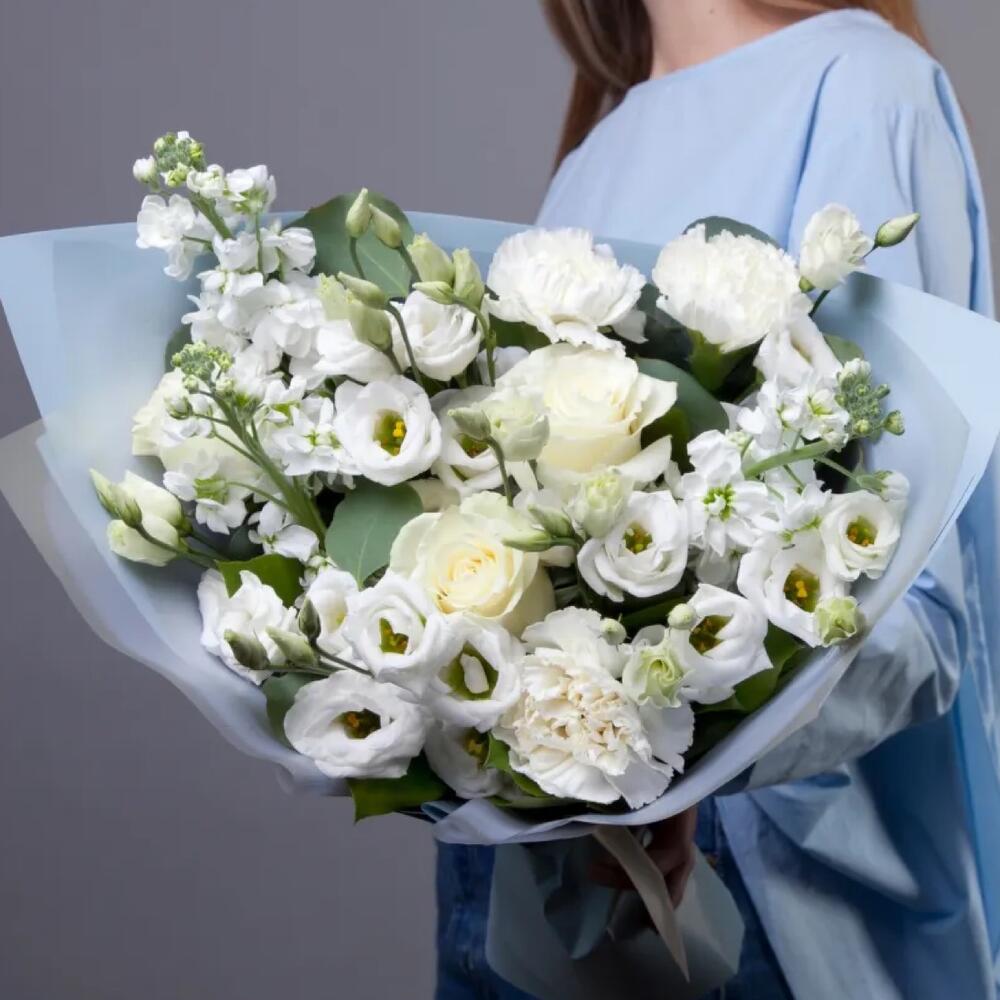 Нежный букет из маттиолы, роз , эустомы и диантусов в нежно голубой упаковке – красивый и стильный подарок близкому человеку